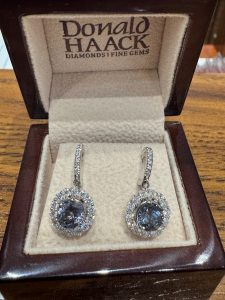 These exquisite diamond and grey spinel earrings from Donald Haack Diamonds will be featured in our Bourbon for Booty auction — benefiting 24 Foundation.